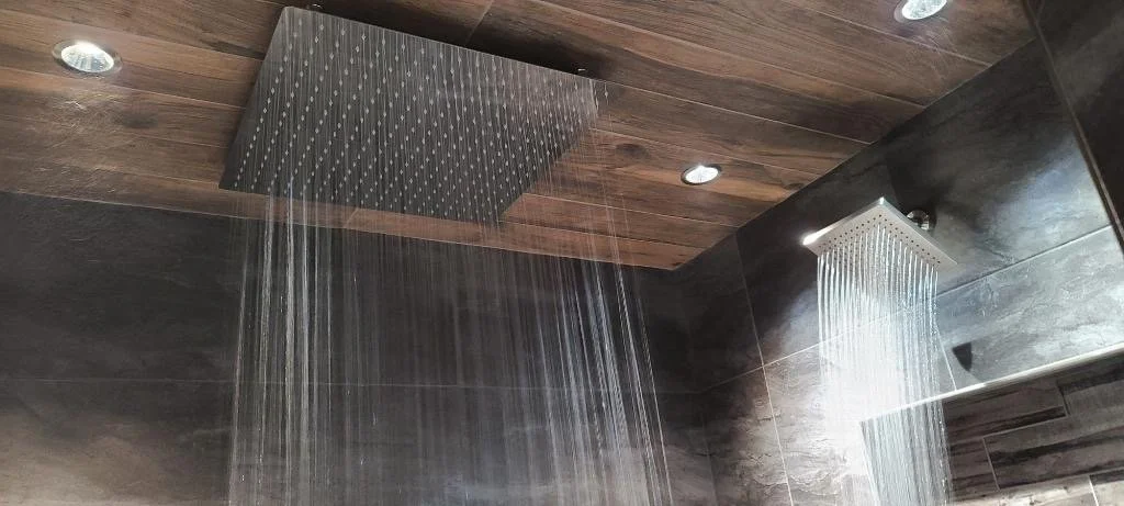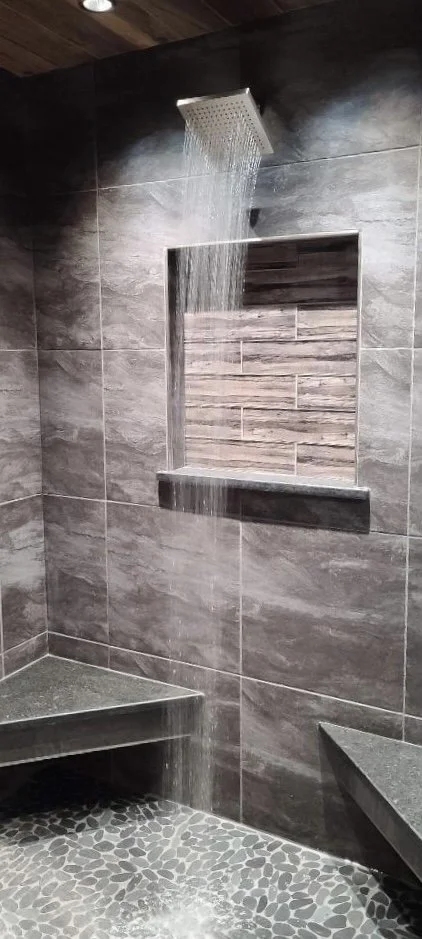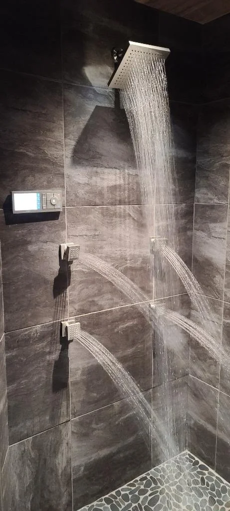 This masculine shower curated with body jets, multiple shower heads, and seating, created an oasis for the client to come home from the oil field and relax in their new, dark + moody primary shower!